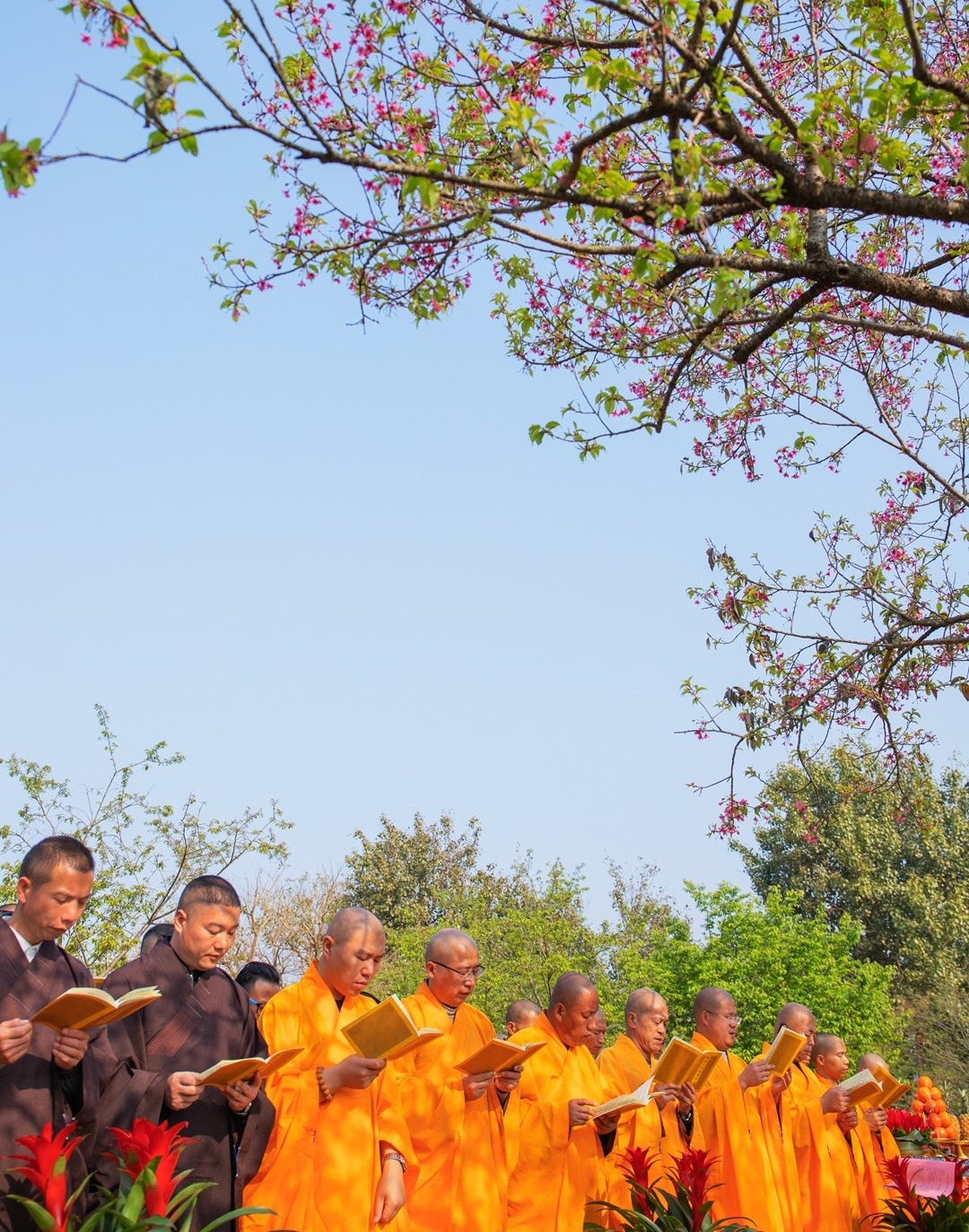 上午9时,钟磬和鸣,梵音高扬,大众云集,合掌敬立。
