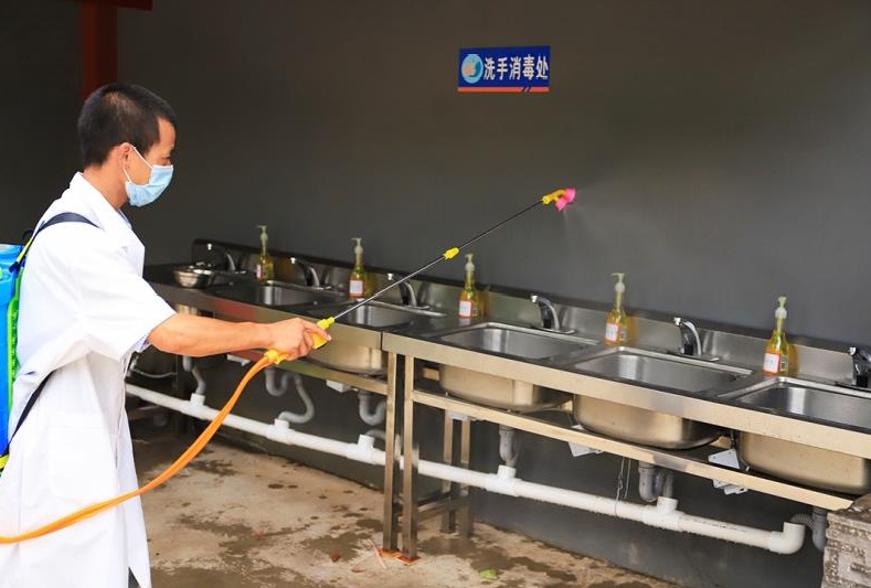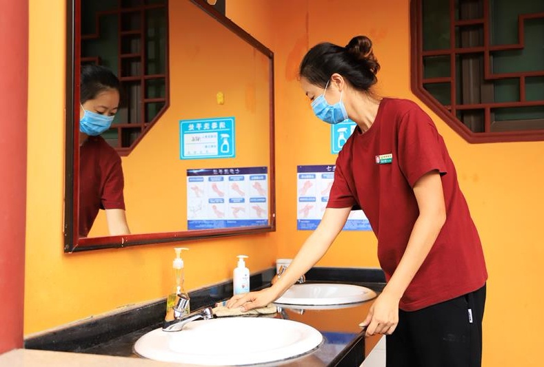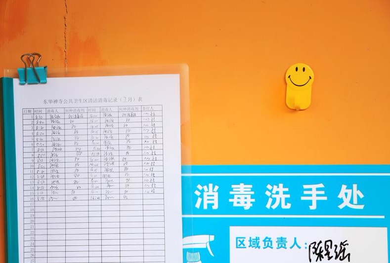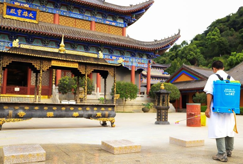 7月16日下午,山门关闭后,寺内对公共卫生场所进行每日例行的全面消杀。