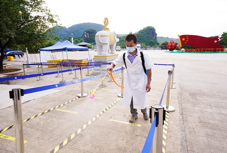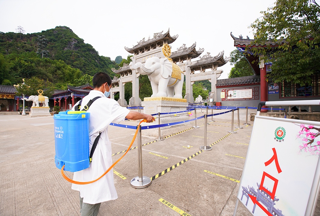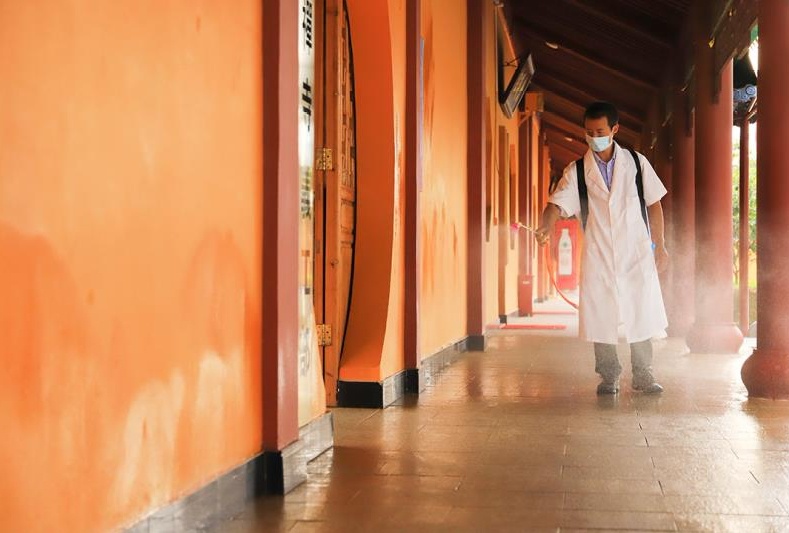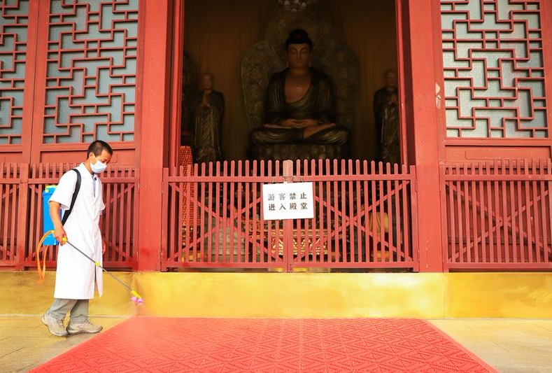 为了确保游客、信众和寺内常住人员的身体健康和生命安全,我寺按照上级有关部门的要求,制定了详细的防控措施。在一天的游览参观过后,寺院专门负责消毒的人员,开始针对每一个场所的每一个角落,进行彻底地清洁、消毒。