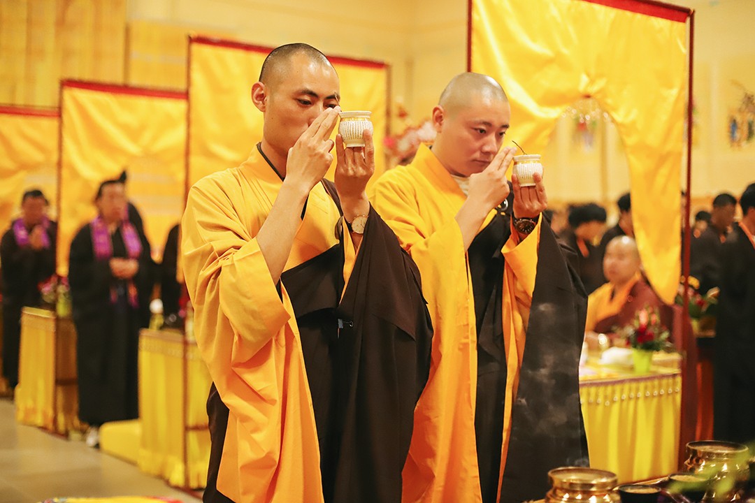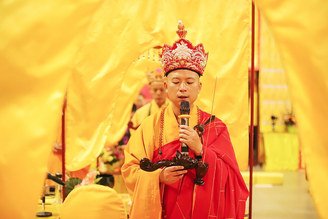 凌晨两点,月辉清透,宝器晶莹,水陆道场气氛庄严。随着钟鼓之音的响起,僧众跟随主法法师梵呗唱诵,清净作观,秉正念祈请诸佛菩萨,龙天护法降临坛城,护持结界。